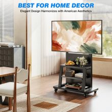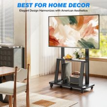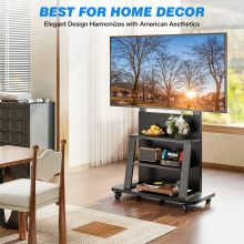• MAKE YOUR TV MOVABLE: OUR mobile TV cart with wheels. Make your TV mobile. Move it to where you want. Don’t need to install your TV on the wall and put holes in the wall anymore.You just rolled it back when you don’t need this mobile TV cart.With locking wheels,Features lockable caster wheels for easy mobility and added security. Making sure it stays put when it reaches its destination.Perfect for home,bedroom, office, shopping mall, conference room,outdoor and more.