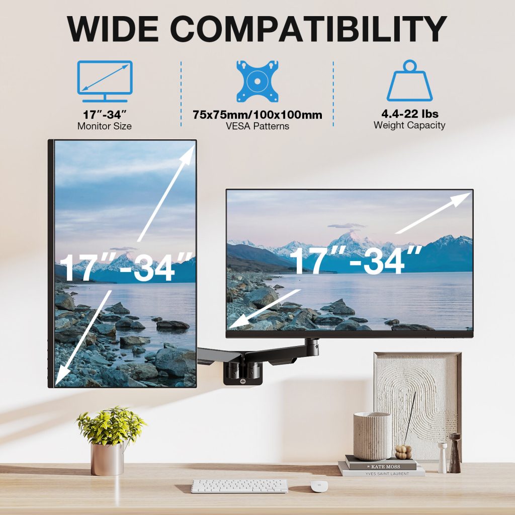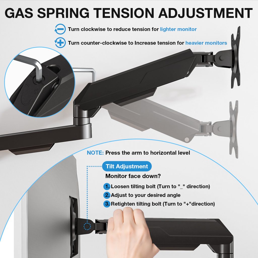 [Extensive Compatibility] Compatible with 34-inch curved display, weighing up to 22 lbs, 75x75mm or 100x100mm VESA flat panel. Note: When the arm of the monitor hangs down, please turn the air shock absorber clockwise to increase the tension