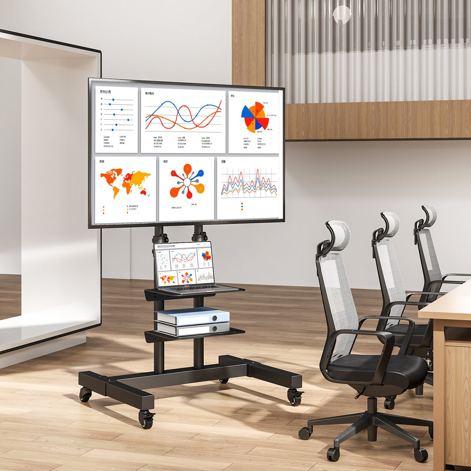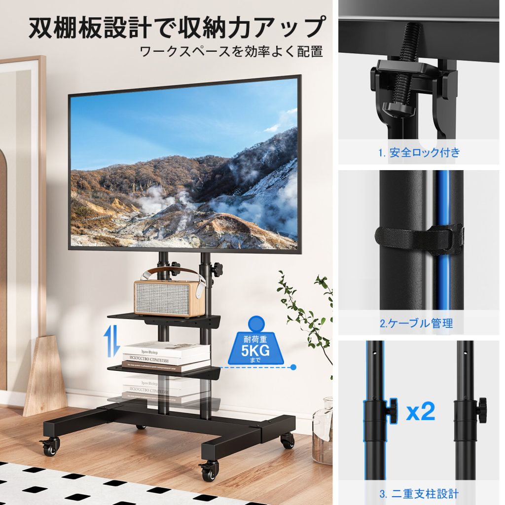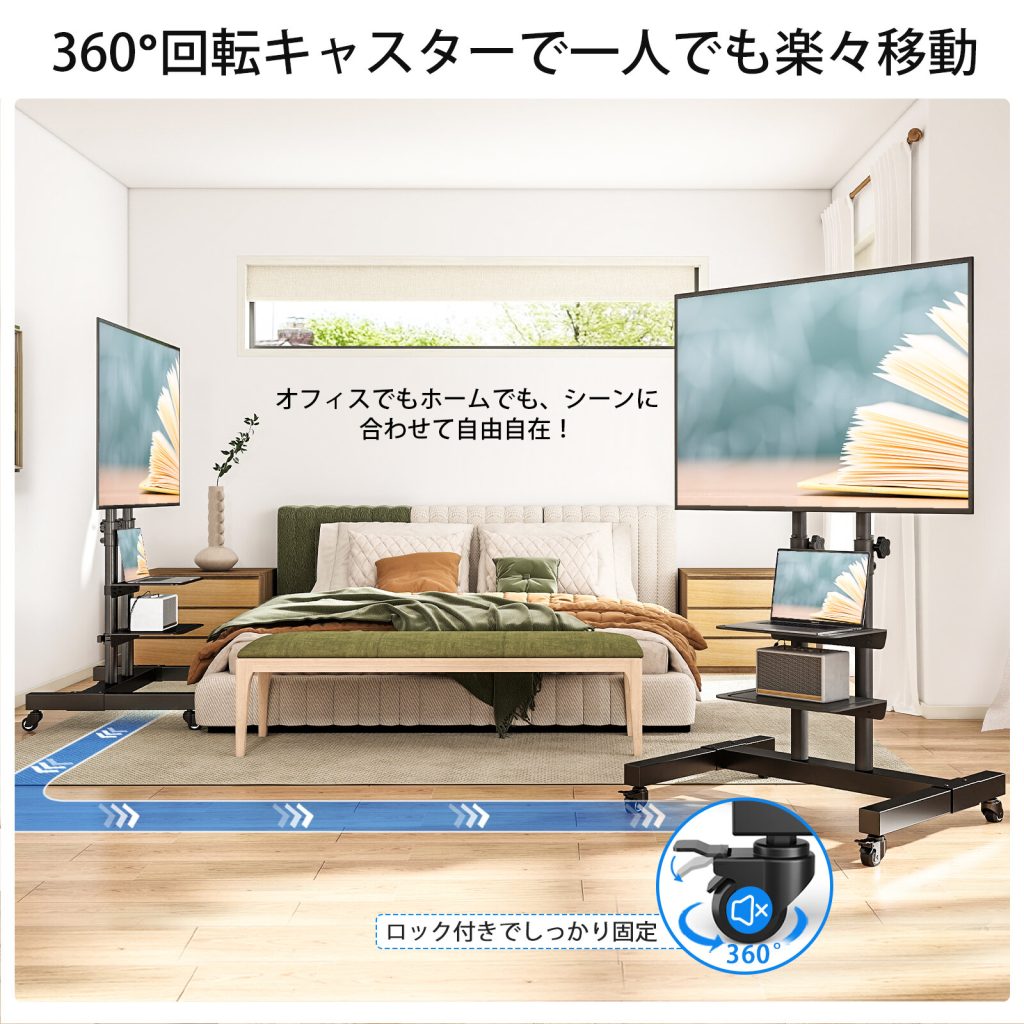 Stable and Convenient to Move: In order to increase the stability of the product, the TV stand with wheels is made of durable steel, and the 2 pillars are designed with a load capacity of 88.2 lbs (40 kg), and the TV is securely attached. The casters are also lightweight and can be rotated 360°, allowing you to easily move it by itself, and the front wheel is equipped with a safety stopper, so it can be secured smoothly with your feet, making it convenient to use even when moving