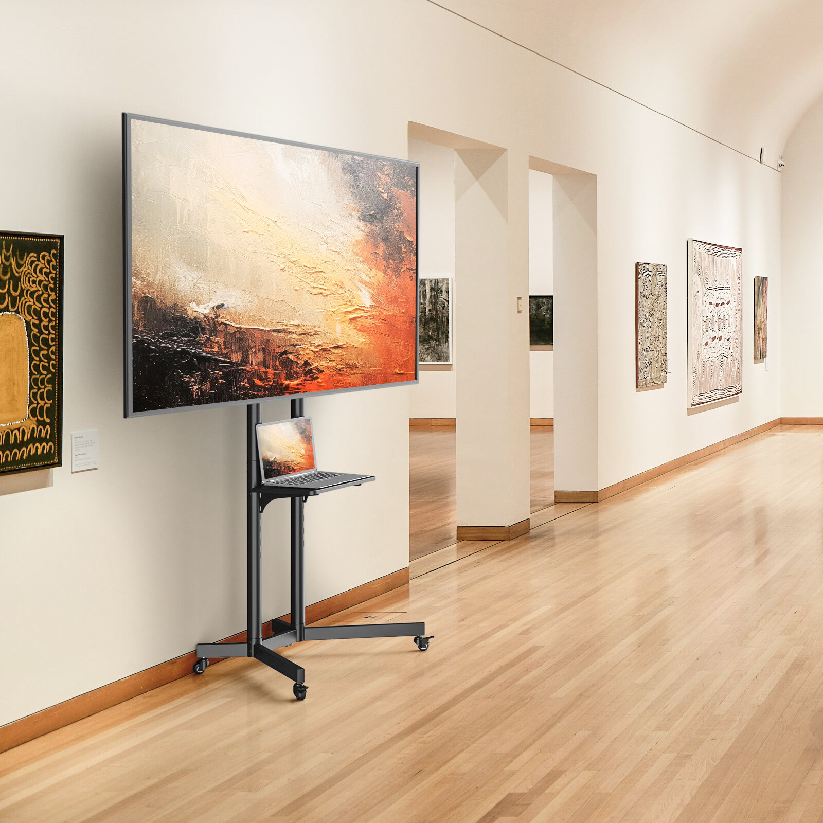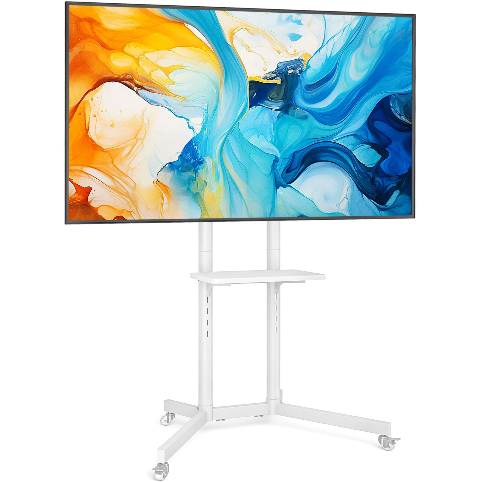 • [UNIVERSAL METAL ROLLING TV CART]–TV cart with wheels fits most 32″ to 85″ Lcd Led Oled Plasma Smart flat panel or curved screen TVs/computer monitors up to 110lbs, mobile tv cart fits Max VESA 600X400mm. 5 Year Manufacturer Warranty.