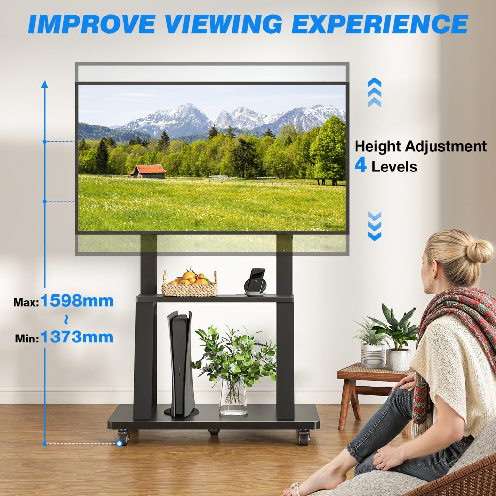 • HEAVY-DUTY TV STAND WHEELS – The floor TV stand is made of sturdy steel and solid welds, with reliable assembly hardware (screws, nuts, etc.). It supports TVs up to 90kg. TV height can be adjusted from 1373mm to 1598mm, providing flexible viewing.