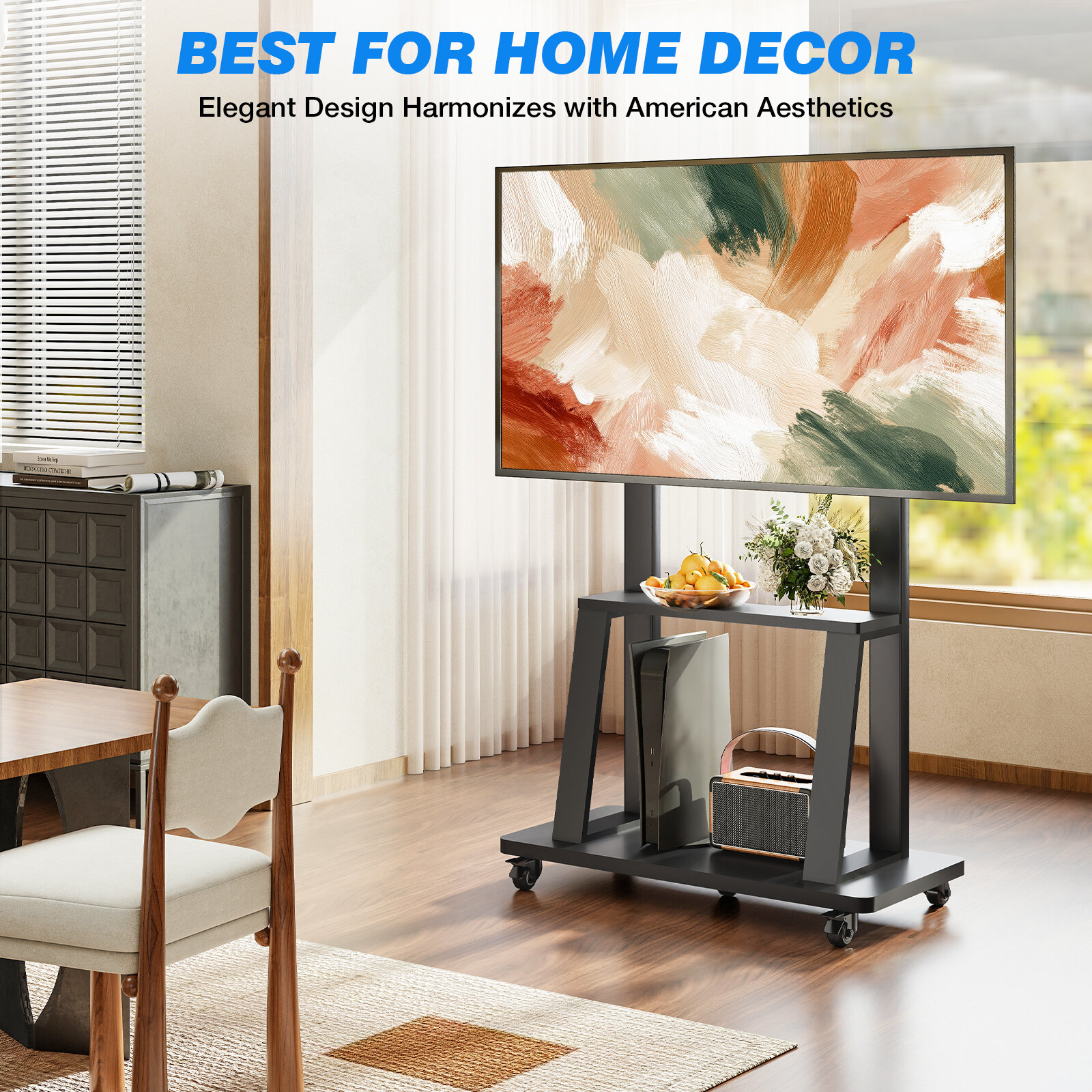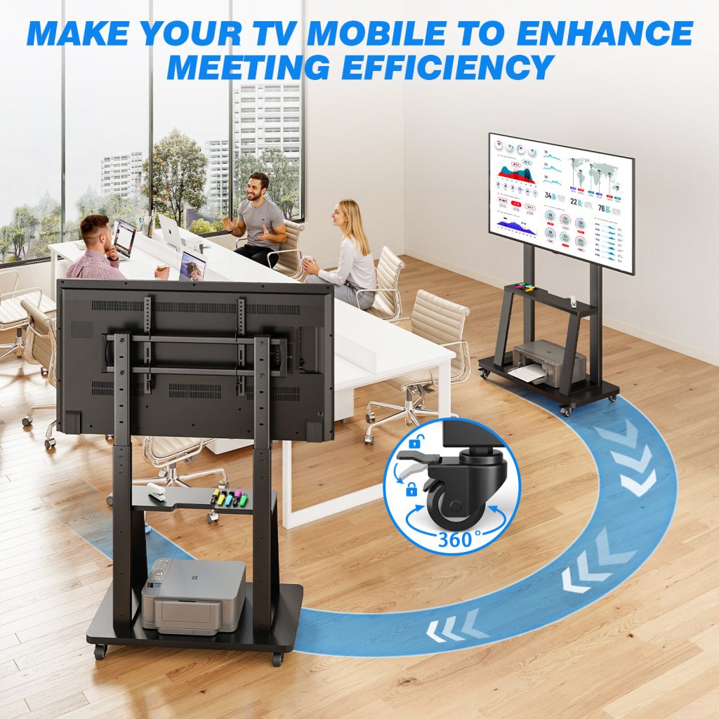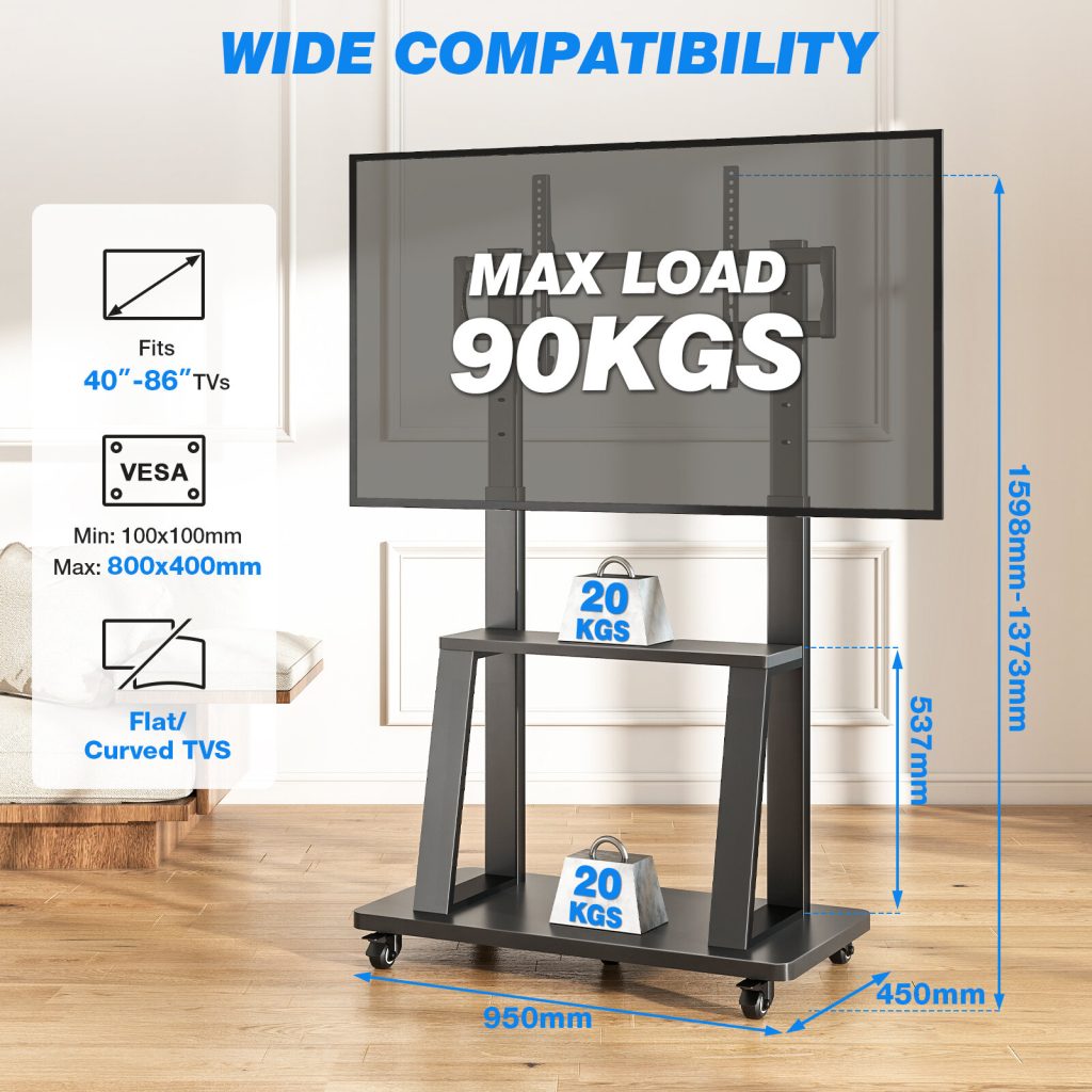 • UNIVERSAL TV CART – This TV stand with wheels fits most 40″-86″ LCD, LED, and OLED flat/curved screen TVs with VESA patterns up to 800x400mm, compatible with most TV brands.