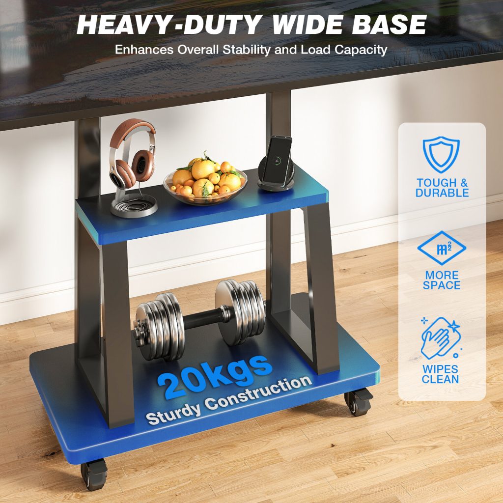 • TV STAND WITH STORAGE – Features two shelves, which supporting up to 20kg, allowing you to store components such as Modem/Router, DVR, PC, PS4, etc.