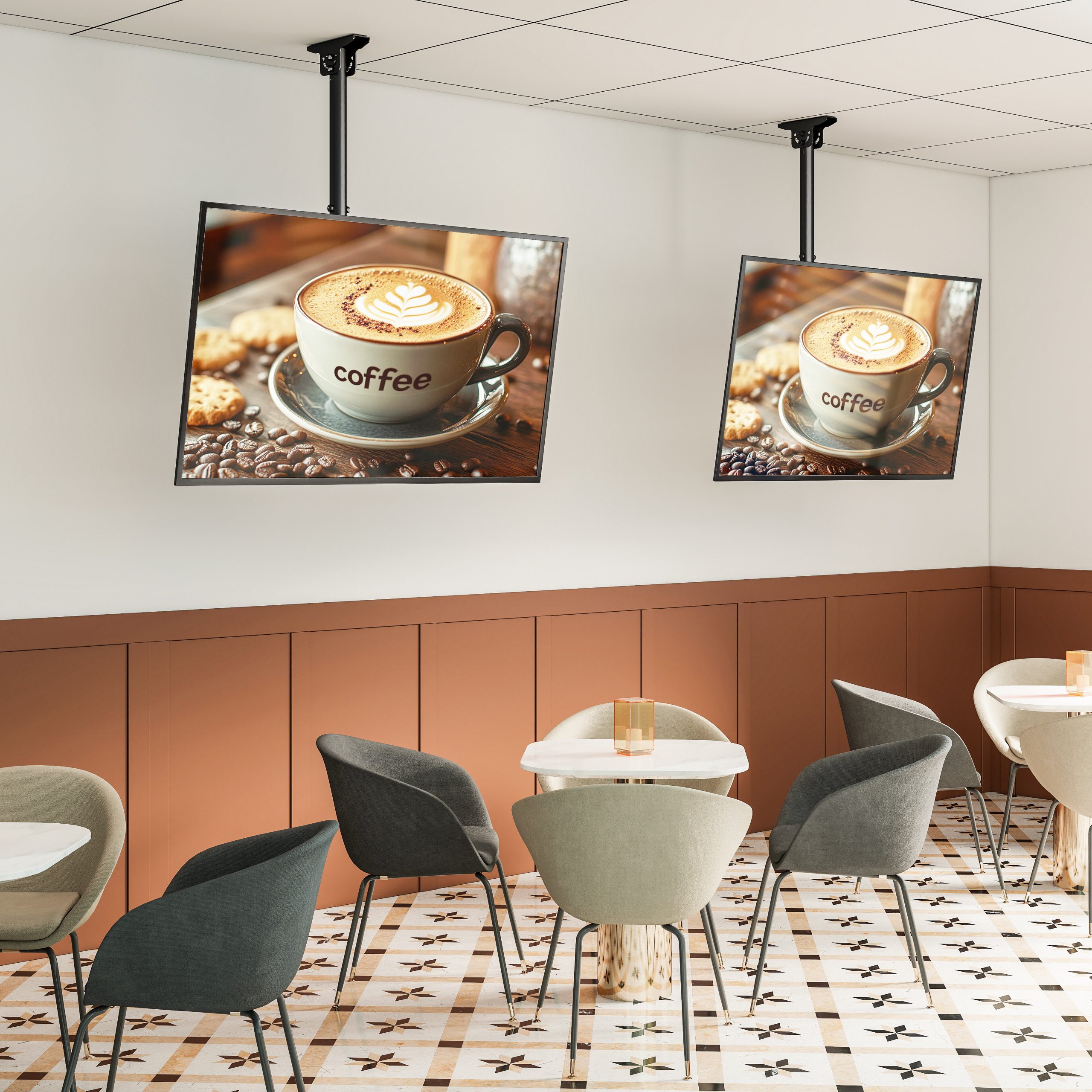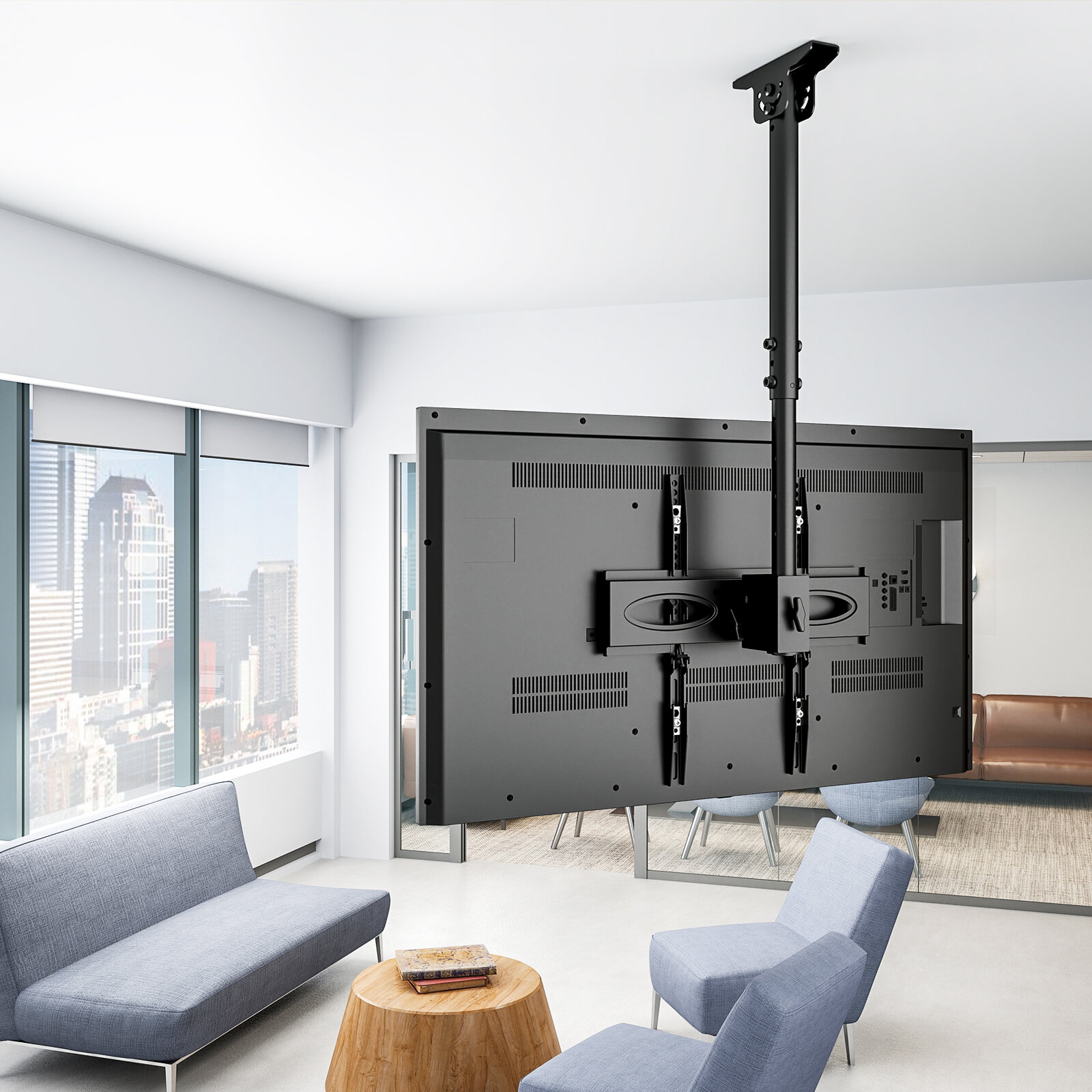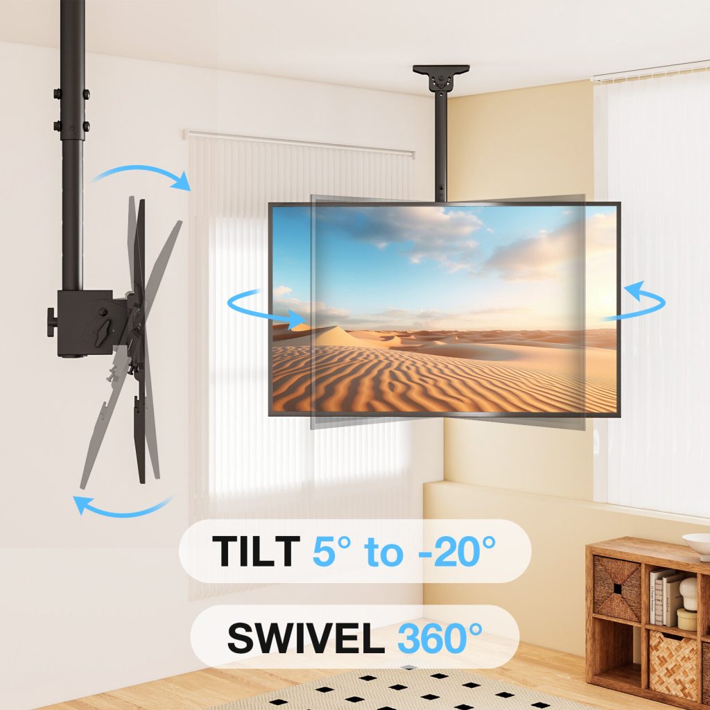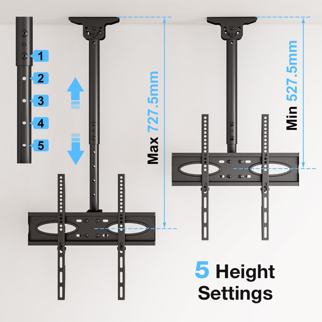 - HEIGHT ADJUSTMENT-Full motion ceiling mount comes with installation template so it really simple to install with a very sturdy construction TV pole mount allows the display to extend 527.5 mm to 727.5 mm from ceiling to center of TV plate for the perfect viewing angle