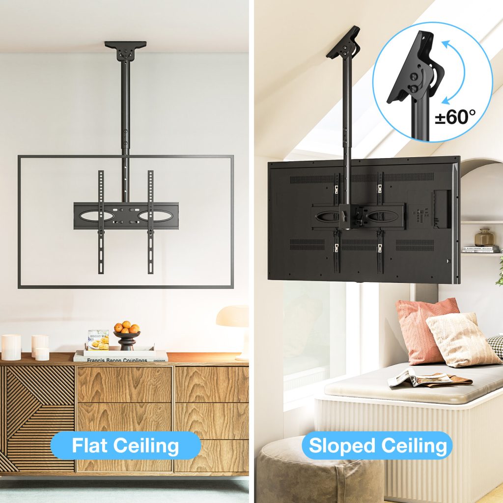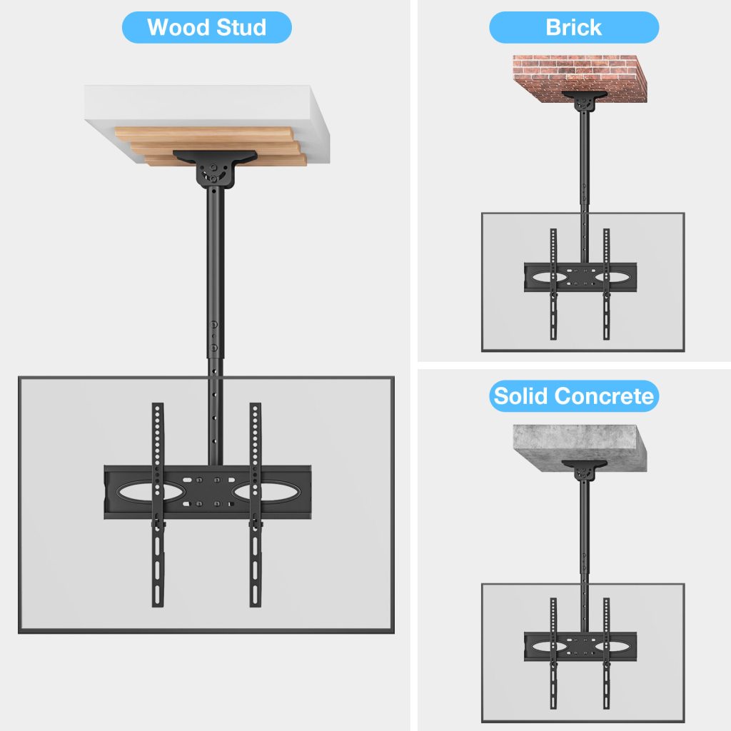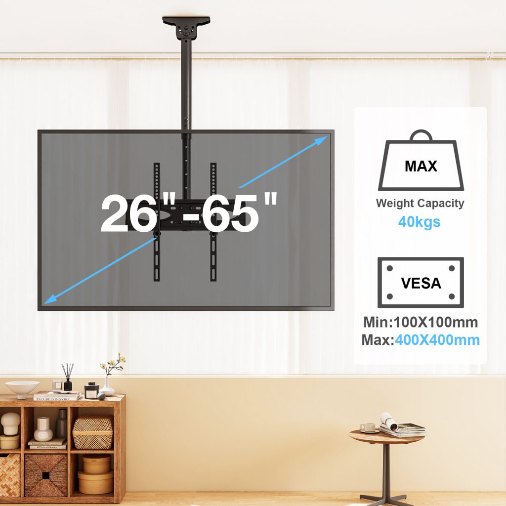 - UNIVERSAL CEILING TV MOUNT- Fits 26-65inch LCD/LED/OLED/Plasma TVs up to 88lbs easily suitable for different brands of TV Compatible with multiple VESA pattern 100x100mm (4″x4″) 200x100mm (8″x4″) 200x200mm(8″x8″) 300×200/200x300mm (12″x8/8″x12″) 300x300mm (12″x12″) 400x300mm (16″x12″) and 400x400mm (16″x16″)