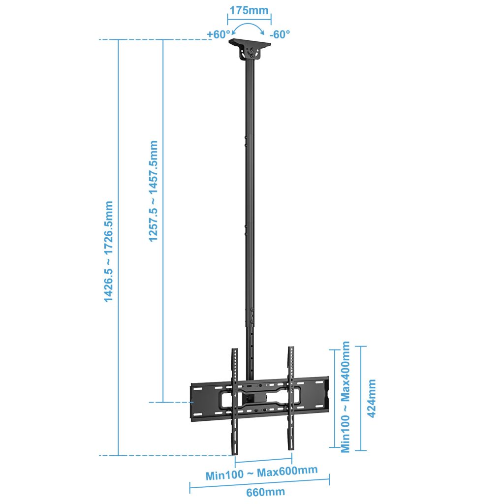 HEIGHT ADJUSTMENT-Full motion ceiling mount comes with installation template so it really simple to install with a very sturdy construction TV pole mount allows the display to extend 1257.5 mm to 1457.5 mm from ceiling to center of TV plate for the perfect viewing angle