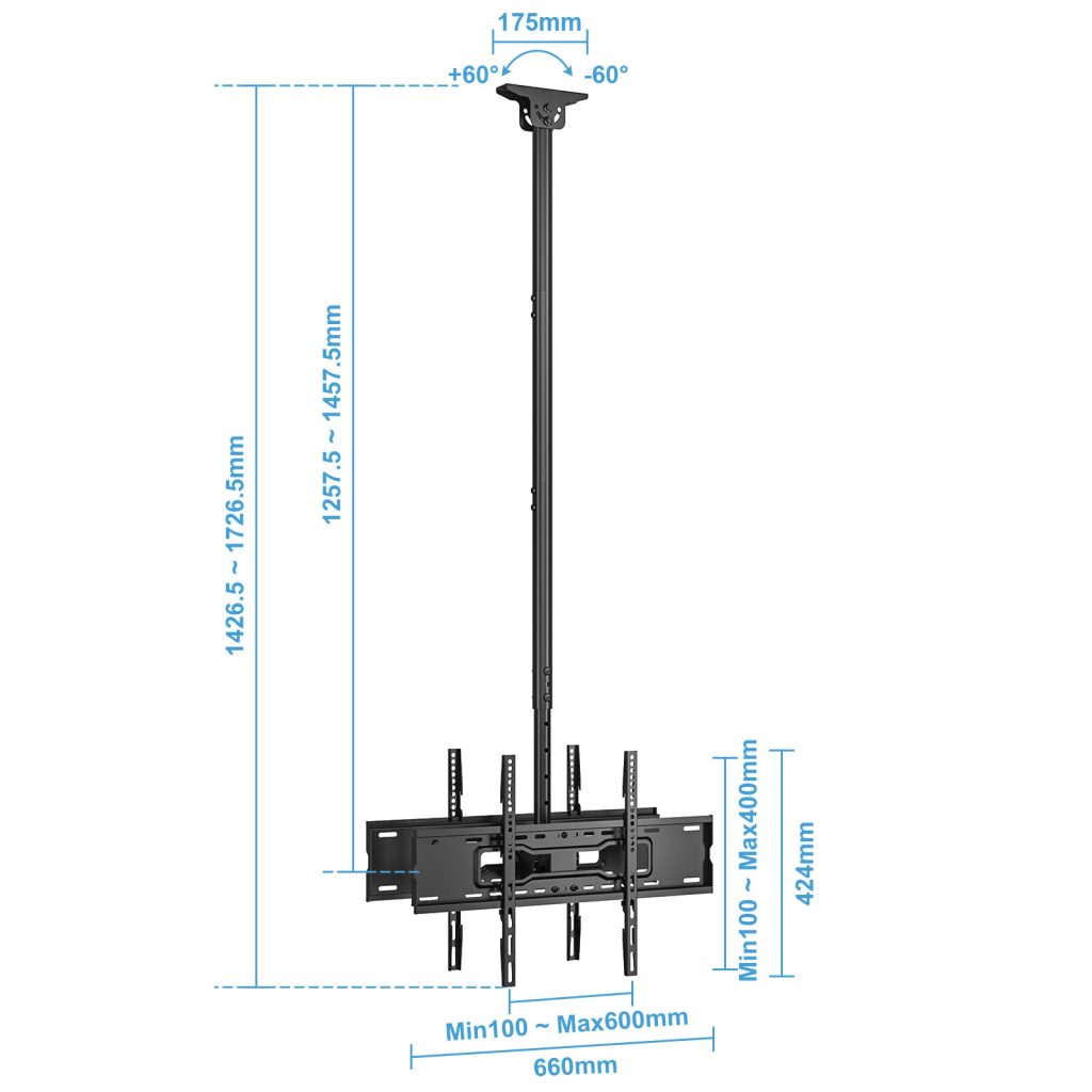 • HEIGHT ADJUSTABLE from 1257.5 to 1457.5 mm between the mid-point of the TV plate to the ceiling.