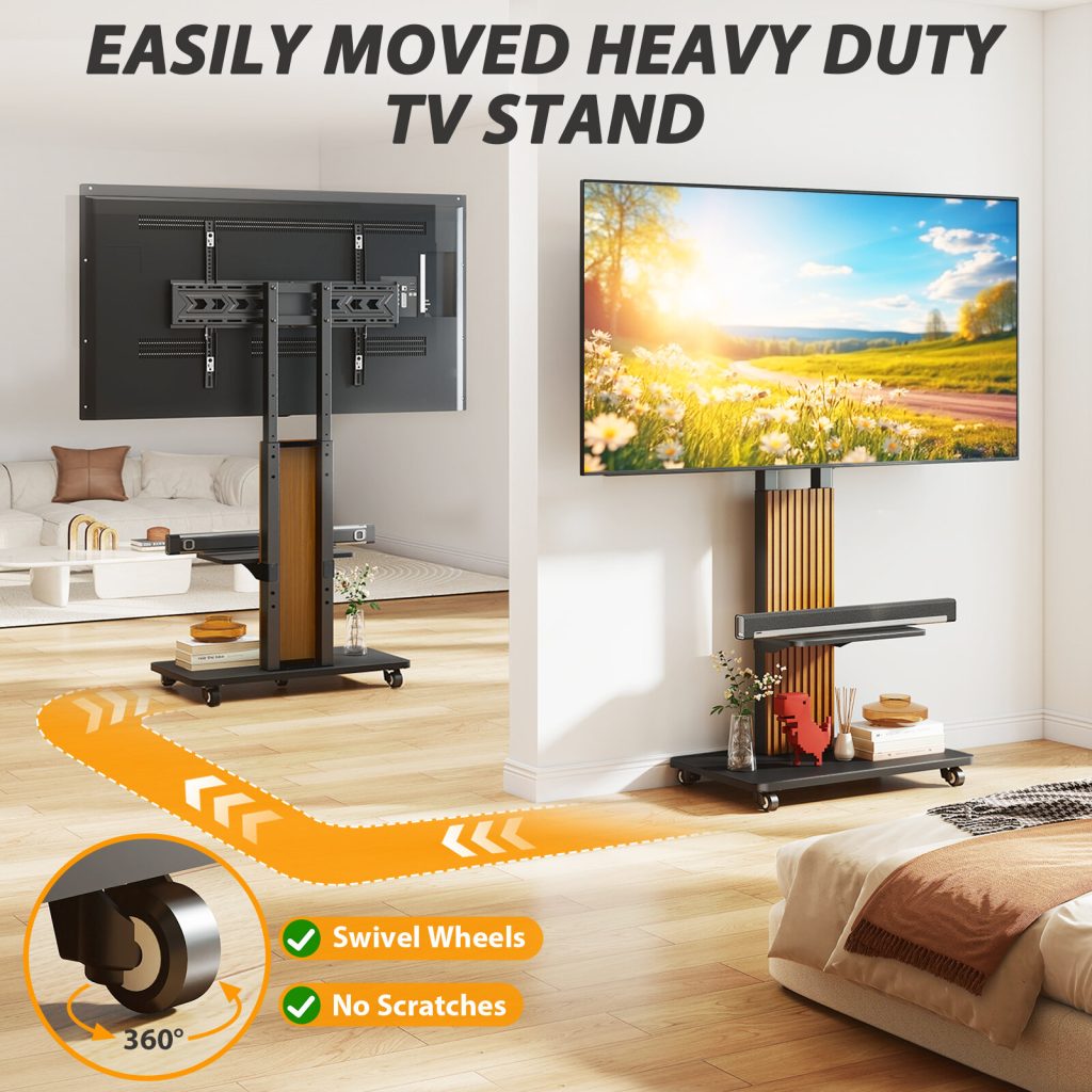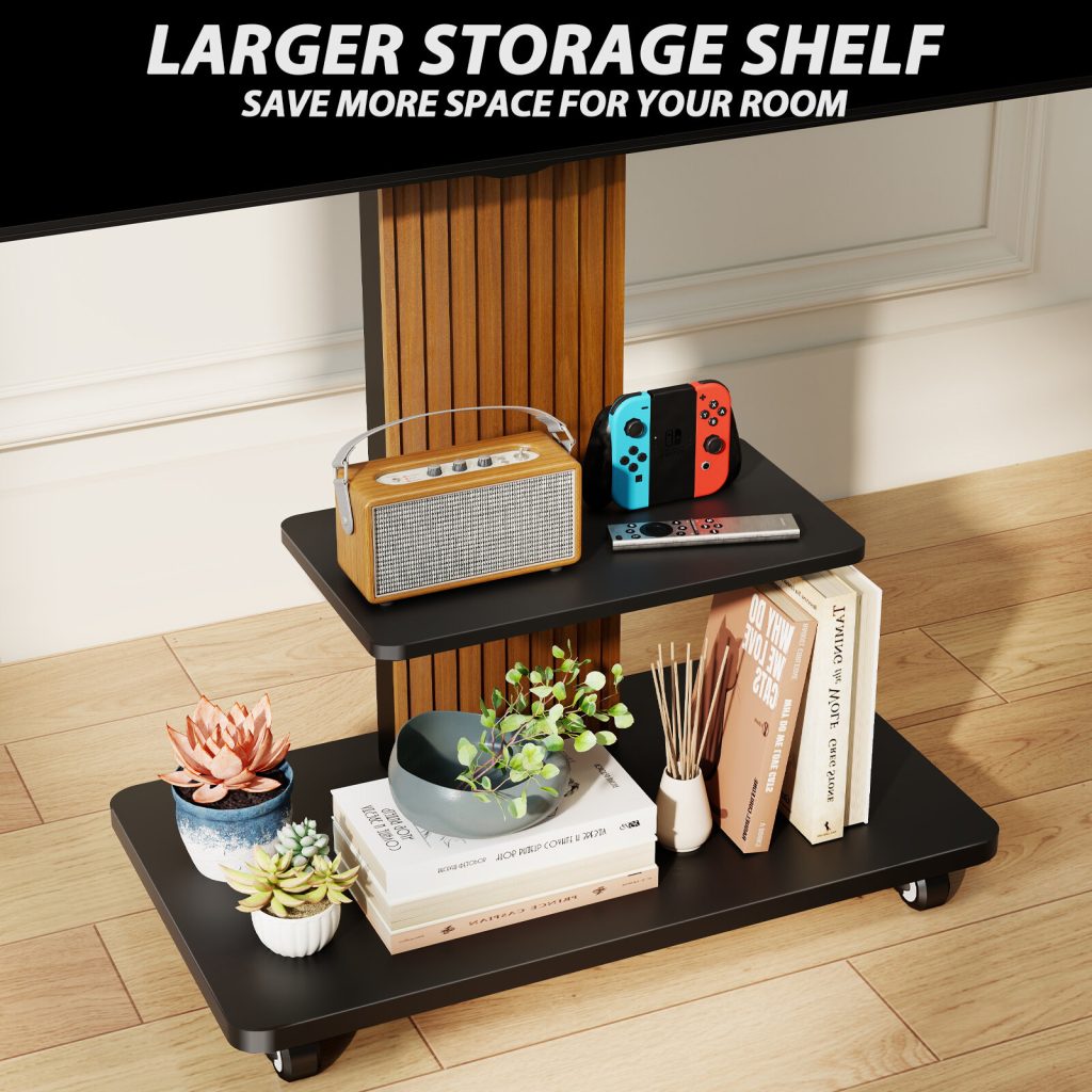 Thanks to its versatility, this tall TV stand for 55-86 inch TV can be equipped with wheels for increased mobility. And with the additional shelves for increased storage space, you can easily organize the multimedia devices, remote controls, or something else you want to keep handy. Generous storage space on the back for cable management ensures order and cleanliness(wheels and shelves not include)