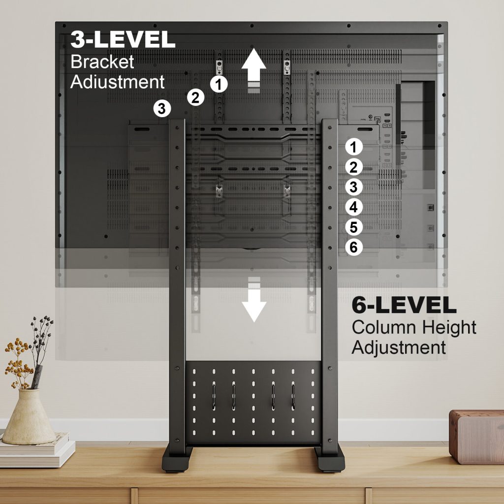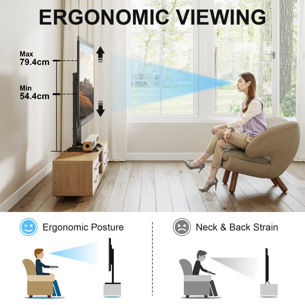 【9 Levels of Height Adjustment】The stand offers 9 height settings, allowing you to adjust the screen center up to 544 mm for the best viewing height. The flexible height options also provide additional space for soundbars, TV boxes, or other devices.