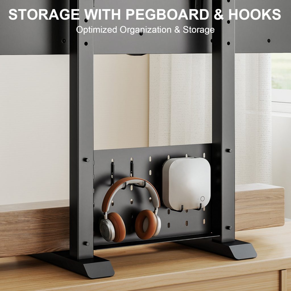 【Pegboard Design with Utility Hooks】Equipped with a perforated pegboard and included hooks, this stand allows you to hang and organize small accessories such as remote controls, headphones, or cables—keeping your entertainment setup neat and convenient.